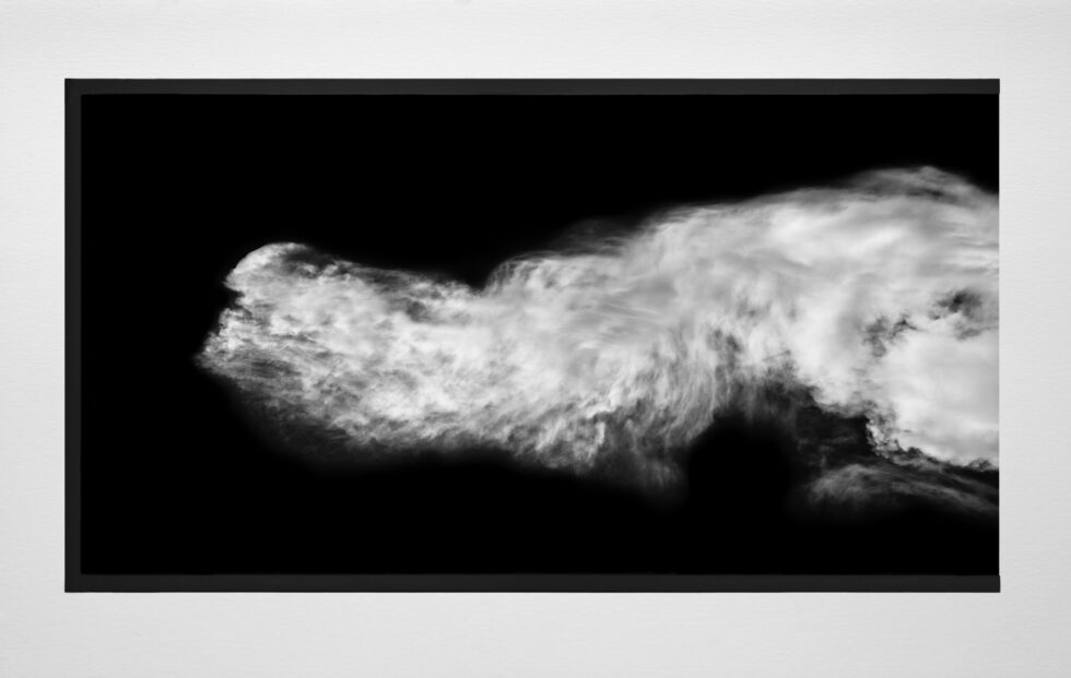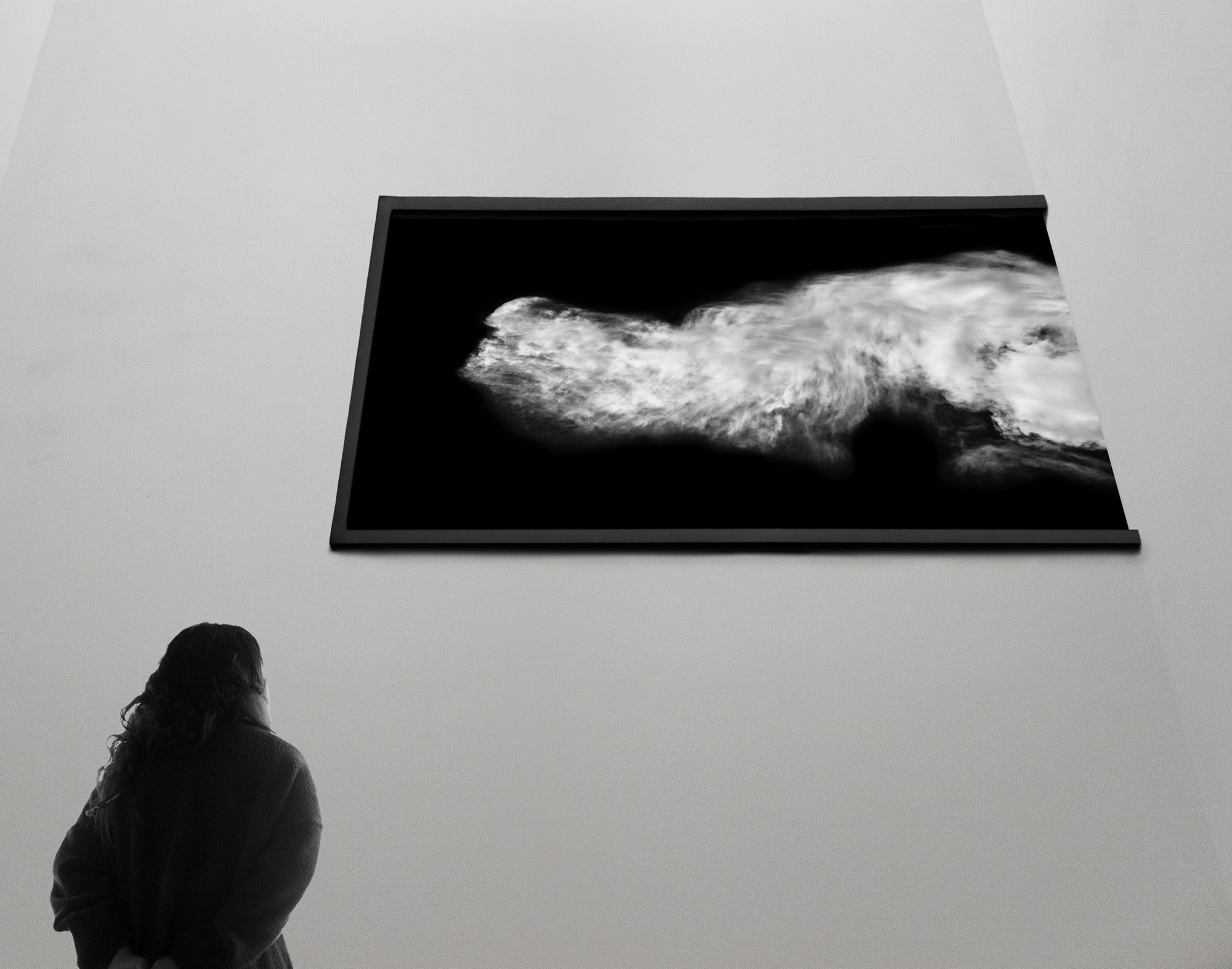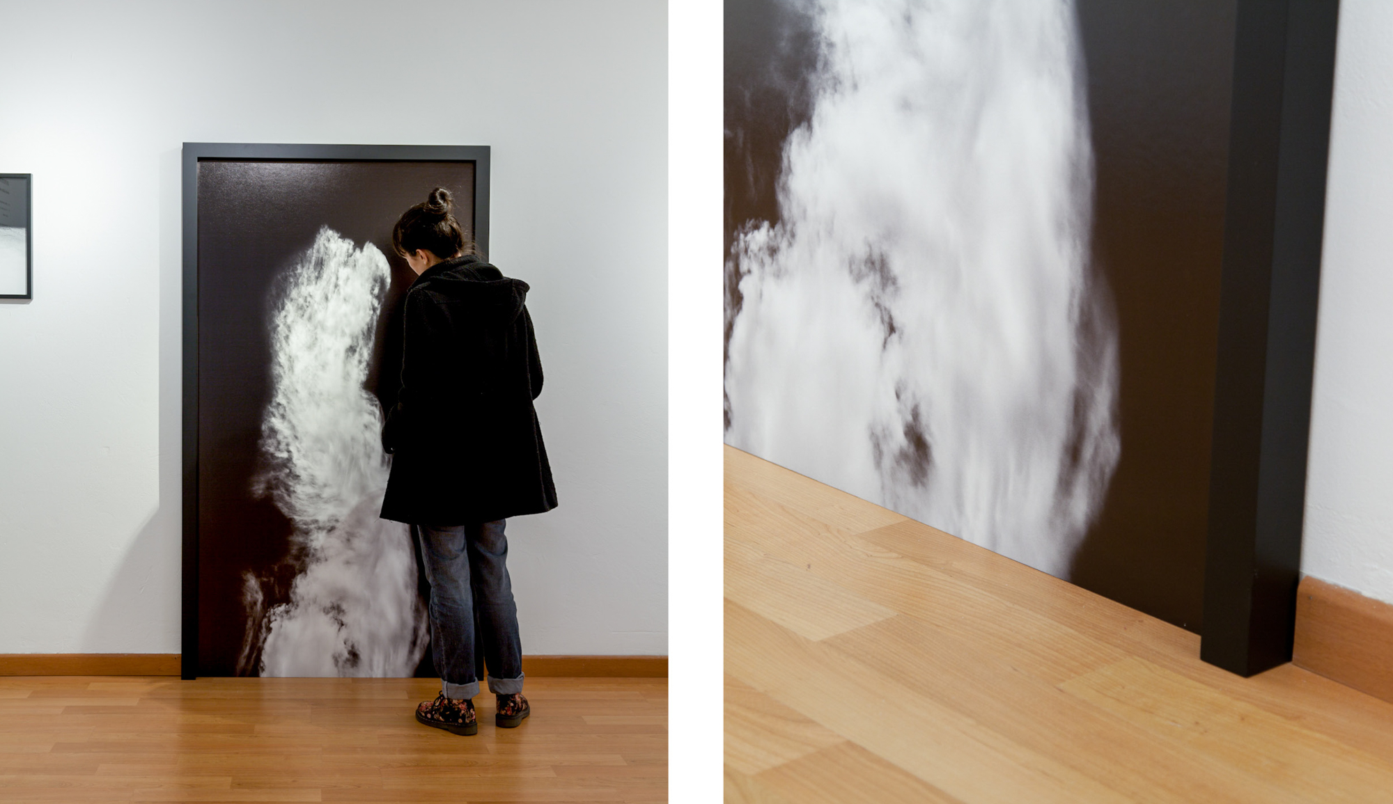 La gran nube es un intento de representar este conjunto de imágenes (que son infinitas) con una sola fotografía. Una nube de metro noventa de ancho y un metro de alto. Decidí enmarcarla para sentir, por así decirlo, que se puede controlar, que se puede “limitar”. Pero no del todo porque dejé un lado de la imagen sin enmarcar, solo el lado donde la nube toca el borde. Ahí pueden pasar muchas cosas, por ejemplo, puede dar la sensación de que la imagen sigue más allá del muro, más allá del espacio, y al mismo tiempo mostrar ese misterio, esa gran nube que entra sin permiso dentro de las casas y llena los espacios con animales, personas, objetos, historias diversas, relatos e infinidad de figuras efímeras.